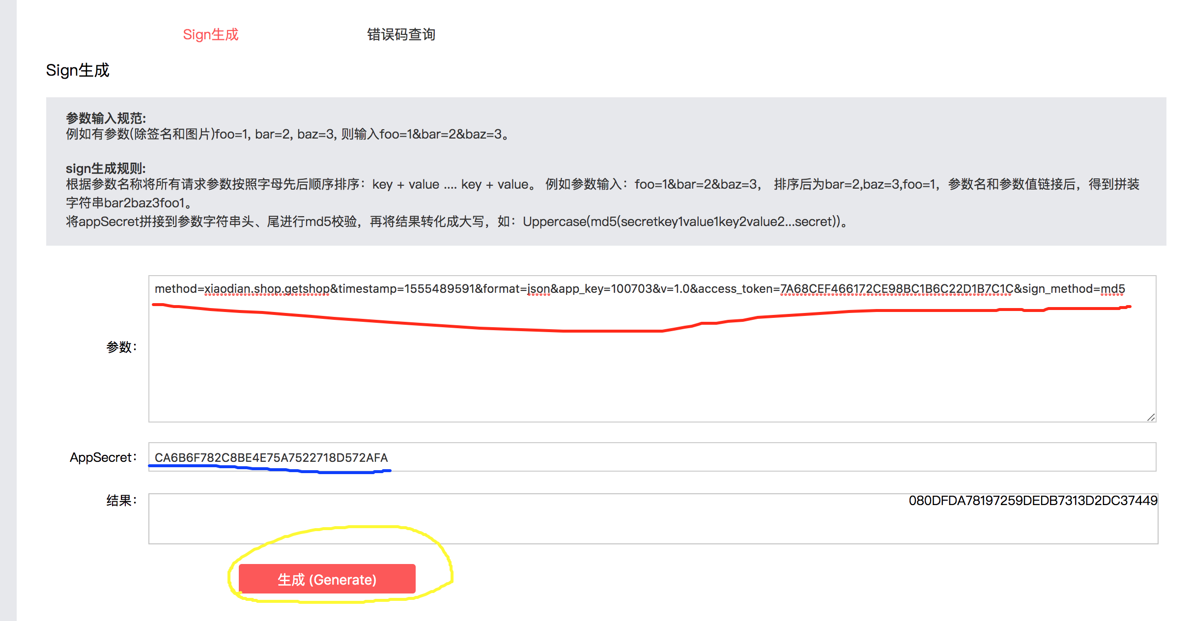e.g. 参数: method=xiaodian.shop.getshop×tamp=1555489591&format=json&app_key=100703&v=1.0&access_token=7A68CEF466172CE98BC1B6C22D1B7C1C&sign_method=md5 AppSecret: CA6B6F782C8BE4E75A7522718D572AFA Sign = 080DFDA78197259DEDB7313D2DC37449 link = https://openapi.xiaodian.com/invoke? + 参数 + 签名 则最后生成的link是: